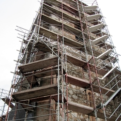 Reinigung der Turm-Fassade, Demontage der Sockelplatten, Abnahme des Pflanzen-Bewuchses, Bruch- und Riss-Sicherung, Öffnen der Fugen und Abnahme des, in den Vorjahren zu viel angetragenen Fugenmörtels, Korrosionsschutz der Eisenteile, Neuverfugung im Sinne des Umbaues im Jahr 1859, Montage der Sockelplatten. Sicherung durch Nieroster-Metallschließen und Abdichtung der Strebepfeiler-Abdeckungen.