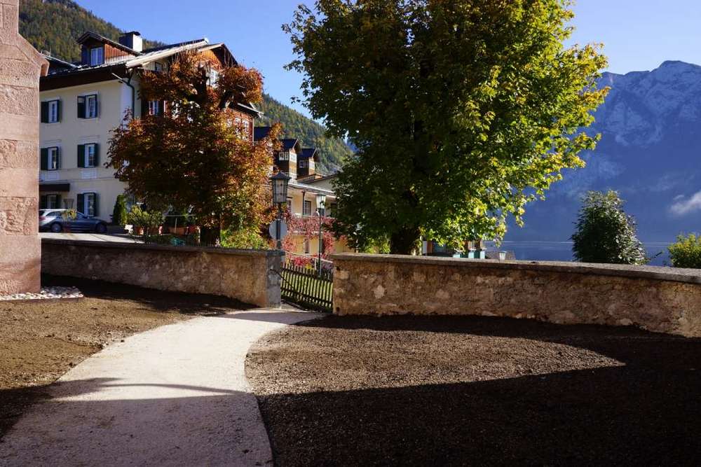 Vom Ende des südseitig gepflasterten Platzes bis zum ostseitigen Stiegen-Abgang führt ein geschotterter Weg.