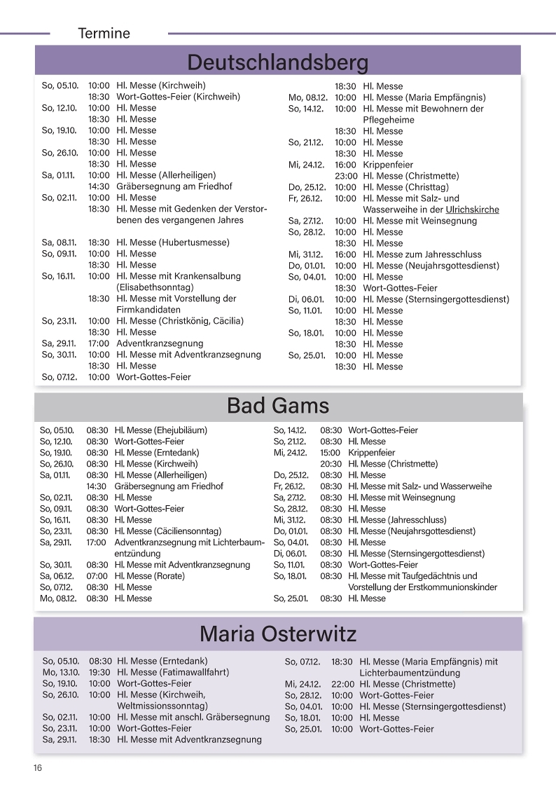 Bad Gams 14:30 Uhr / Deutschlandsberg 14:30 Uhr / Frauental 14:30 Uhr / St. Jakob 8:30 Uhr / St. Josef 15:00 Uhr / Stainz 14:30 Uhr / St. Stefan 13:30 Uhr